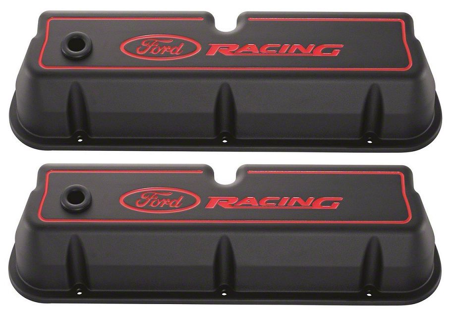 These great looking black crinkle finish cast aluminum valve covers are a great addition to your small-block Ford engine. They feature openings with rubber grommets on both sides to be used for PCV valves, oil breathers, or whatever combination you need. The logos are recessed into the aluminum and are painted red so they really stand out. You can use whatever standard size valve cover gasket you prefer. They even include hardware.