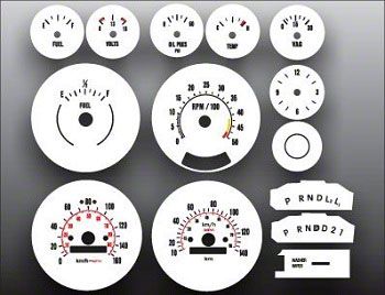 White Face Overlays Included In This Kit: 160 KM/H Speedometer,140 KM/H Speedometer,5000 RPM Tachometer,Volts Gauge,Temperature Gauge, Oil Pressure Gauge,Small Clock Gauge,Vacuum Gauge,Blank Gauge,Shift Indicator Gauge