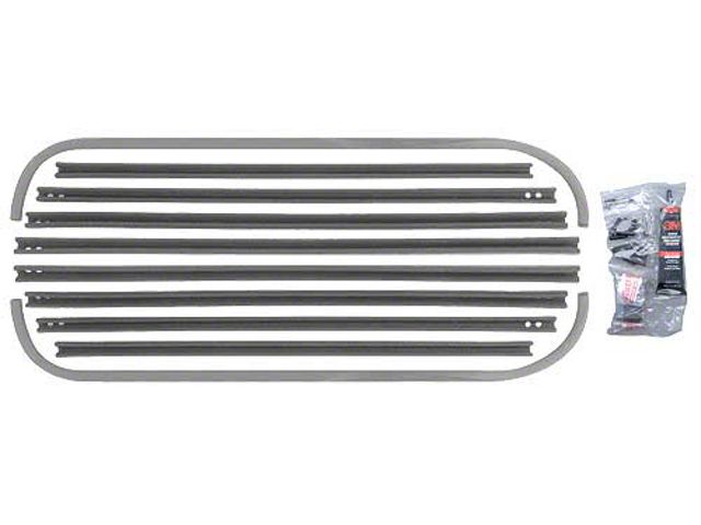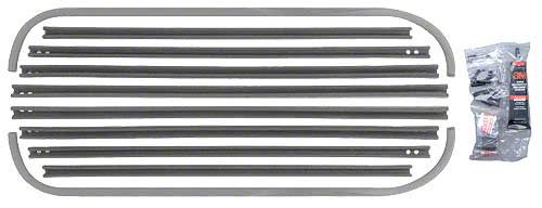 Includes glass run channels, upper window sponge cushions, lower glass rubber stop bumpers and garnish moulding rubber bumpers. 3M adhesive is included.