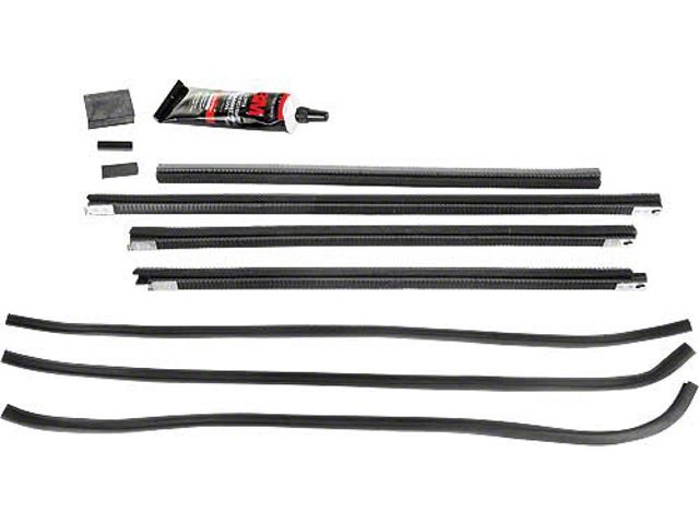 Includes glass run channels, (8) pieces total, upper window sponge cushions, lower glass rubber stop bumpers and garnish moulding rubber bumpers. 3M adhesive is included.