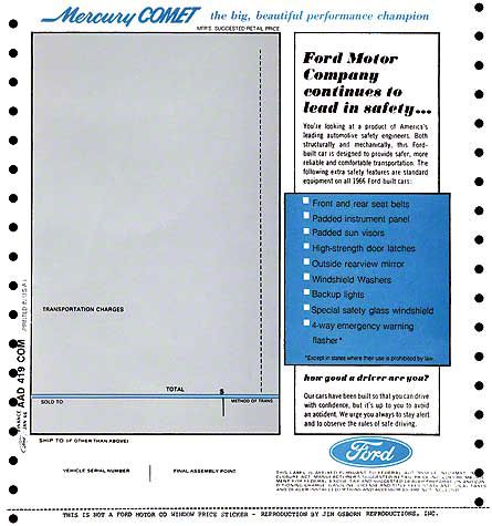 Window Price Sticker - New Car (1966 Comet)