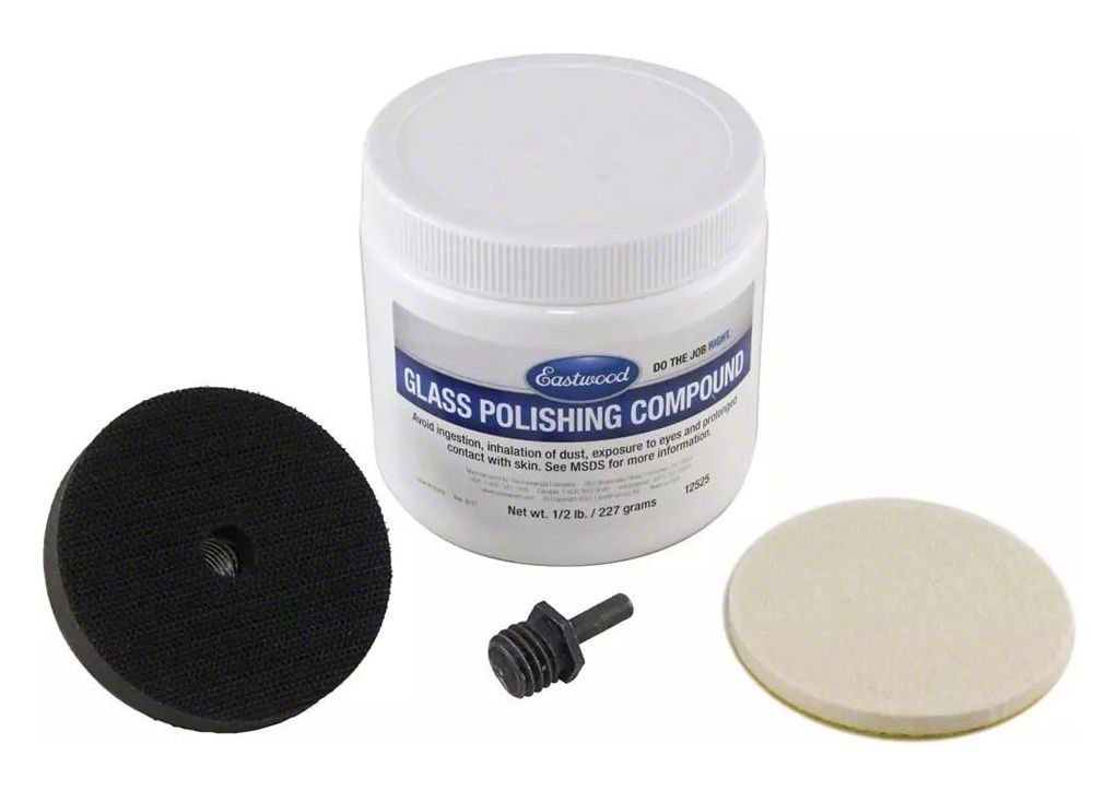 Used by professional shops, this kit eliminates light scratches, wiper haze, sand sparkle and clears up old glass (scratch cleanup is limited to defects that cannot be caught with your fingernails). Kit includes buffing wheel, 1/4" shank adapter and a 1/2 lb. can of compound. Enough to do severa